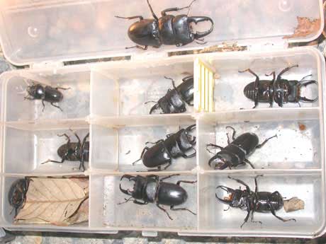 というわけで ヒラタ♂12(うちリリース3)♀3、ノコ♂1、カブト♂2♀1、コクワ少々という成果でした。