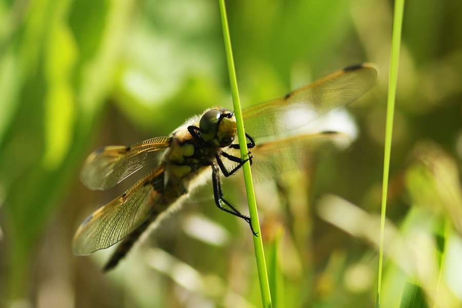 すぐに水際でフワフワと飛ぶ羽化したてのヨツボシトンボを発見。